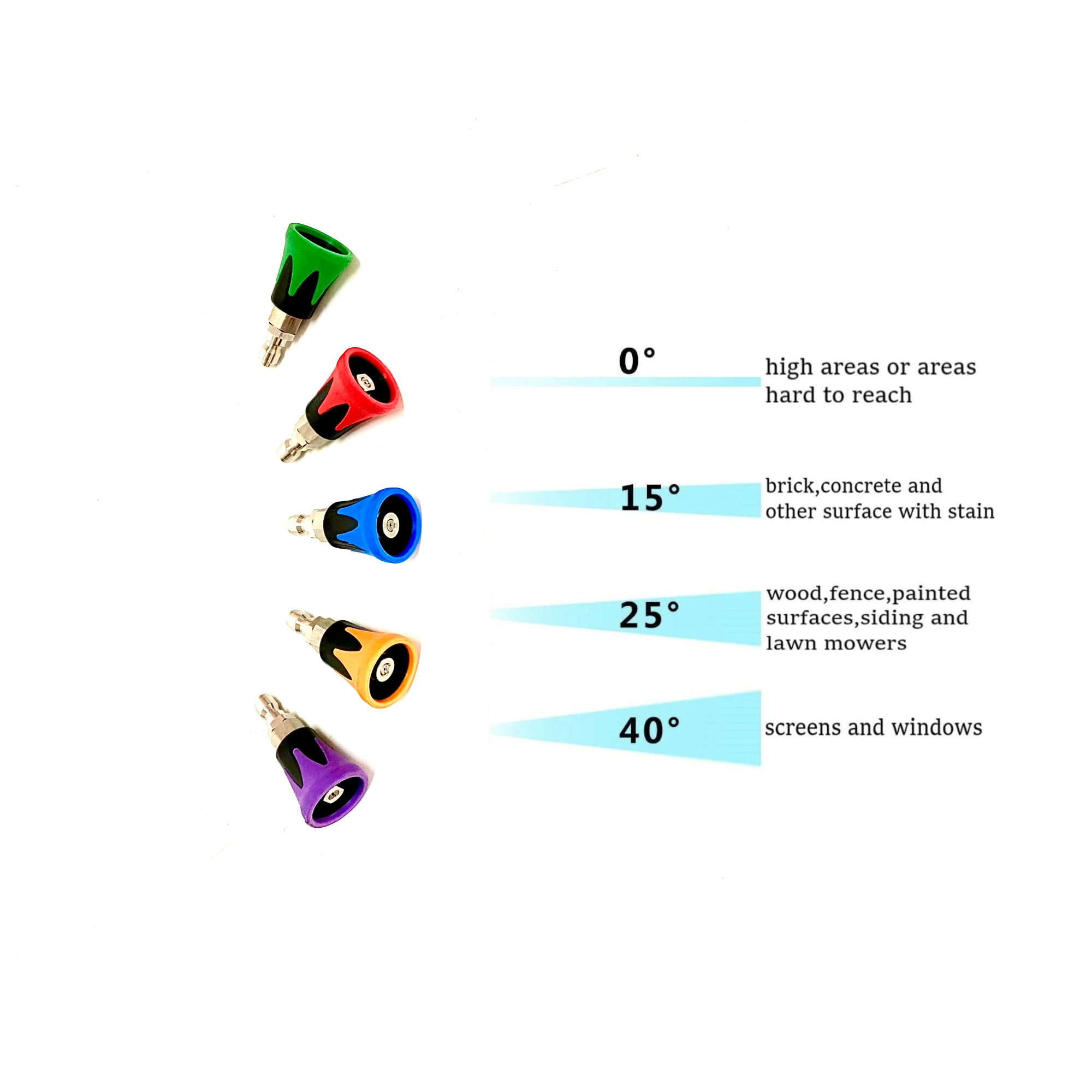 * [Cleaning Performance] This high-pressure washer nozzle provides 4 versatile spray patterns: 0°, 15°, 25°, and 40°. You can flexibly adjust the spray to match different cleaning tasks with ease.