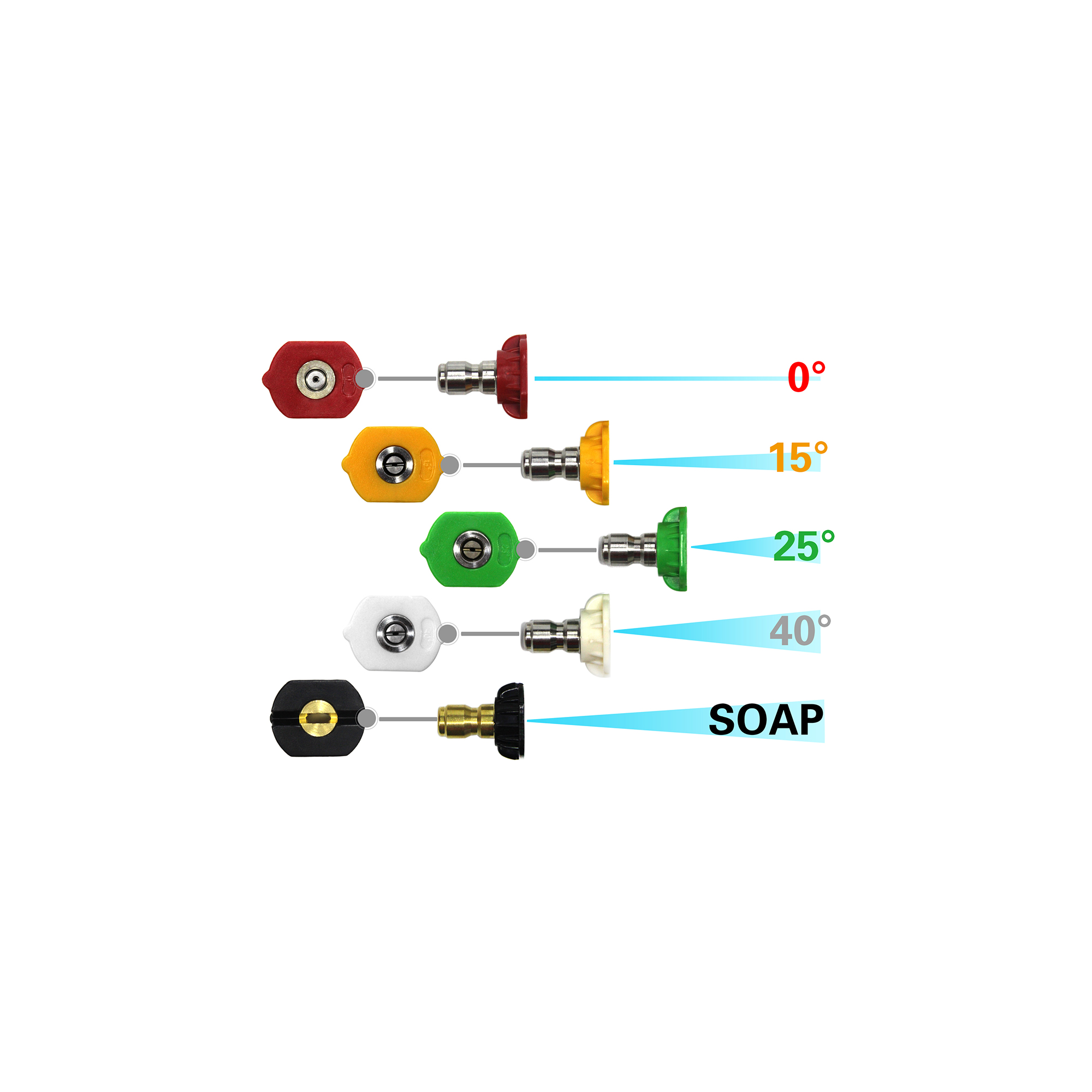 0°, 15°, 25°, 40°, soap tip